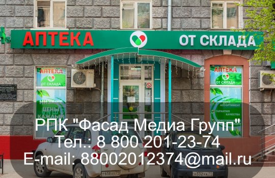 РПК «Фасад Медиа Групп» изготовила и установила рекламную вывеску для нашего клиента – сети аптек. Процесс изготовления рекламной конструкции занял 20 рабочих дней. Для установки потребовалось 2 рабочих дня