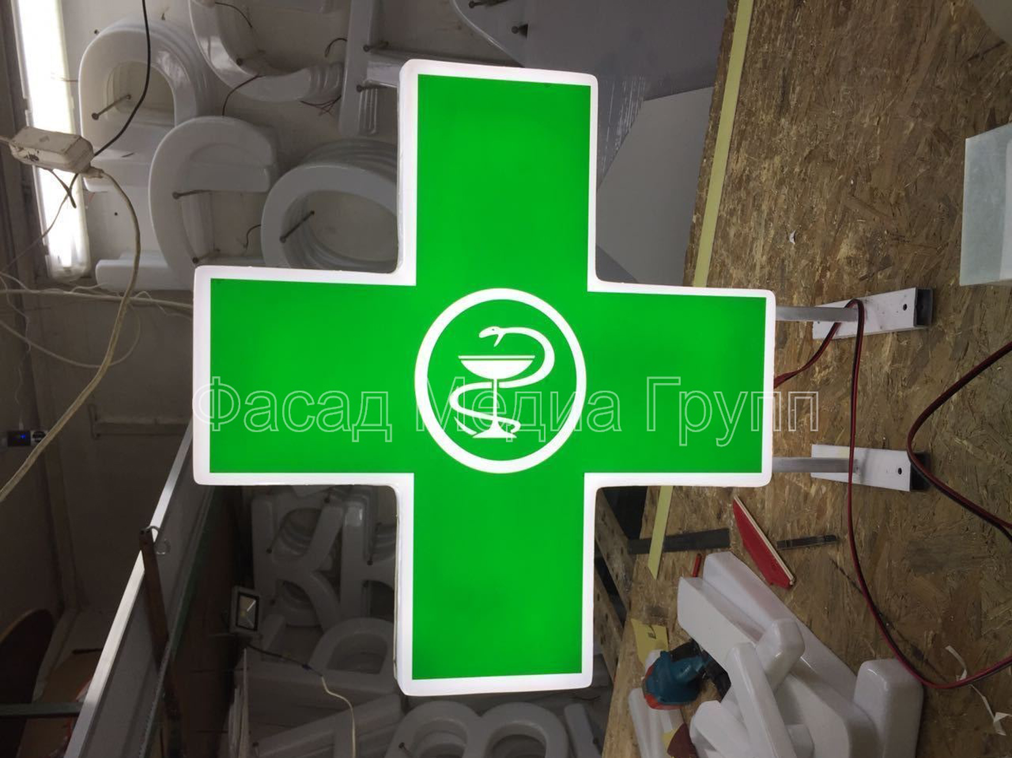 Рекламно-производственная компания "Фасад Медиа Групп" занимается изготовлением аптечные кресты «под ключ»:
