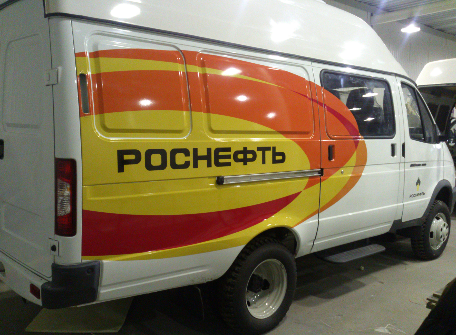 Можно сделать вывод, что при оклейке корпоративных машин нами применяется как виниловая аппликация самоклеящейся пленкой, так и полноцветная печать на самоклеящейся пленке с последующей ламинацией и наклейкой на борта транспортного средства.