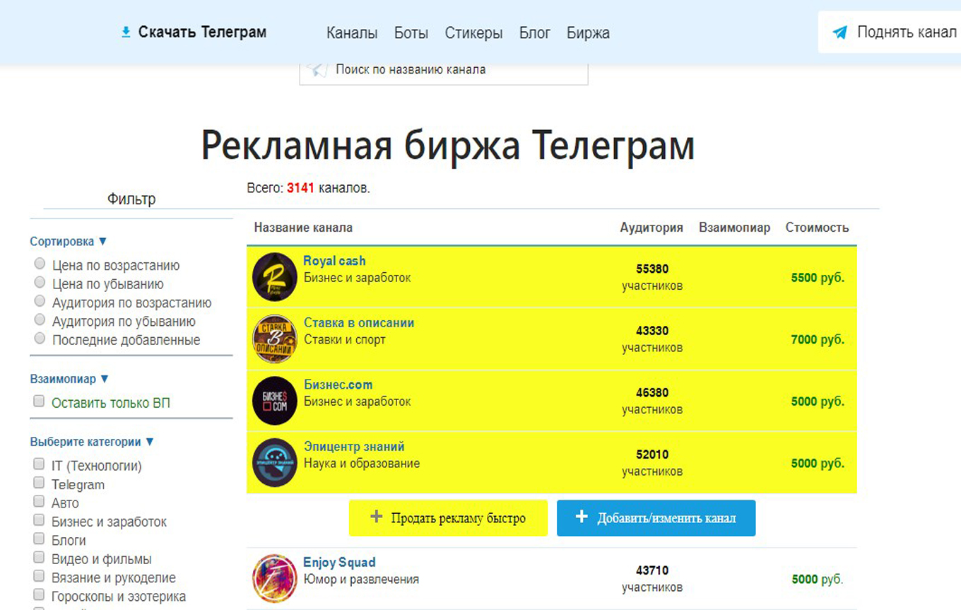 Биржа рекламы в Telegram (Телеграм) представляет собой сайт, на котором представлены различные Телеграм-каналы, отсортированные по критерию: