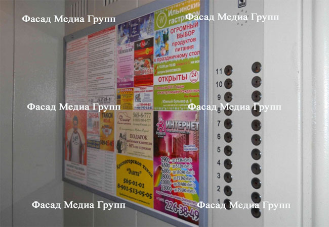 В условиях городской среды размещение информации в лифтах является эффективным средством продвижения бренда организации, поддержания внимания к вашему бизнесу, привлечения новых клиентов и удержания старых покупателей и заказчиков. Именно реклама в лифтах помогает горожанам увидеть необходимую рекламную информацию. Реклама в лифтах способствует быстрому распространению информации, хорошей заметности рекламного материала, делает рекламную кампанию еще более эффективной, а бизнес прибыльным. Для размещения рекламы в лифтах обращайтесь в рекламное агентство «Фасад Медиа Групп». Будем рады сотрудничеству.