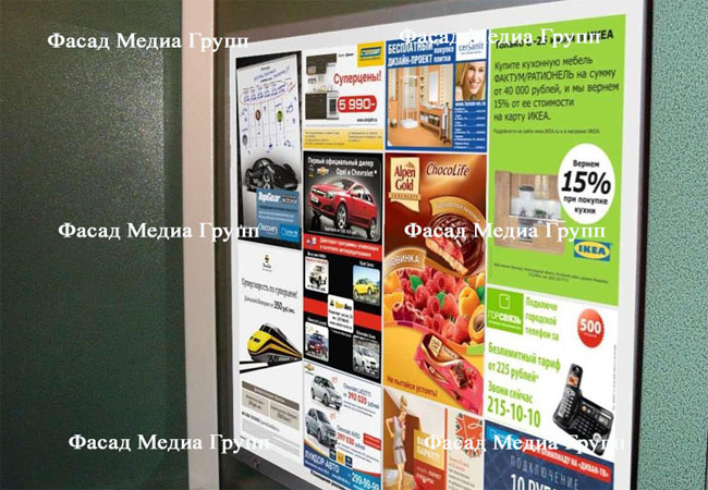 3) В зависимости от форматов печатная реклама в лифтах бывает: