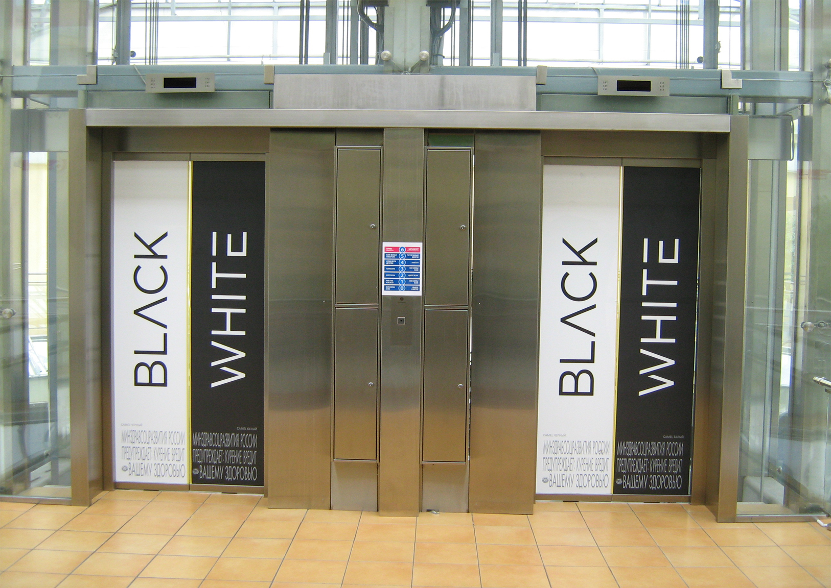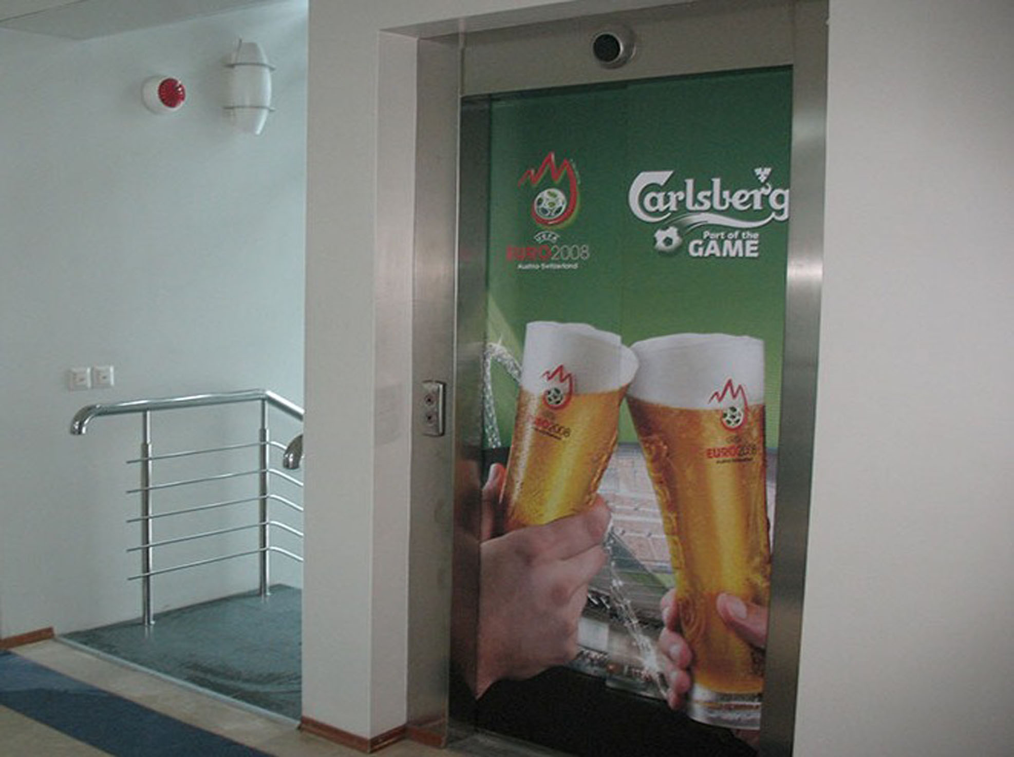 Пример брендирования дверей кабины лифта самоклеящейся пленкой представлен на фото:
